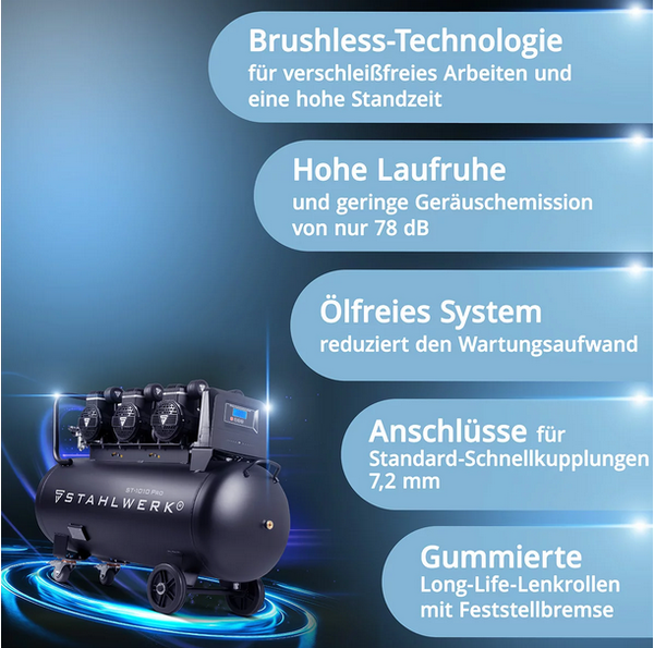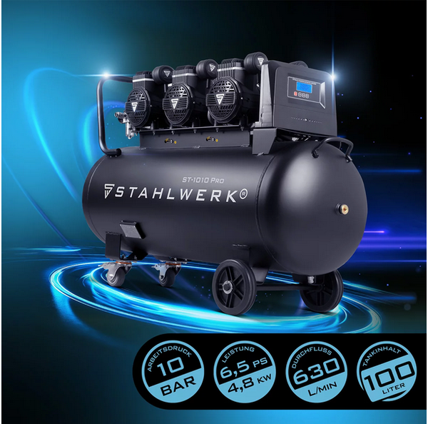 Der ölfreie Druckluft-Kompressor eignet sich mit einem Kesselvolumen von 100 l und einem maximalen Arbeitsdruck von 10 bar ideal zum professionellen Betreiben von Druckluft-Werkzeugen. Ausgestattet mit modernster Brushless-Technologie der neuesten Generation arbeitet der Flüster-Kompressor nahezu verschleißfrei und gewährleistet eine hohe Standzeit. Drei kraftvolle Kolben-Motoren treiben den Kompressor mit einer Gesamtleistung von 6,5 PS bzw. 4,8 kW an und sorgen für eine Abgabeleistung von 630 l/min. Zudem reduziert das ölfreie System den Wartungsaufwand auf ein Minimum. Über die Motorsteuerung mit integriertem Digital-Display lassen sich die einzelnen Motoren des Kolben-Kompressors je nach Bedarf zu- oder abschalten. Der Luft-Kompressor besitzt einen hochwertigen Wasserabscheider mit Druckminderer zum Einstellen des Luftdrucks sowie ein präzises Manometer zum Ablesen der eingestellten Parameter. Anschlüsse für Standard-Schnellkupplungen mit einer Nennweite von 7,2 mm ermöglichen einen schnellen Wechsel der Druckluft-Schläuche und den Einsatz verschiedener Druckluft-Werkzeuge. Der Silent-Kompressor überzeugt durch eine hohe Laufruhe und ermöglicht geringe Geräuschemissionen von nur 78 dB, selbst beim Abrufen der Maximalleistung. Gummierte Long-Life-Lenkrollen mit Feststellbremse ermöglichen ein unkompliziertes Manövrieren und Rangieren des Kompressors. Die Kompressoren erfüllen die Richtlinie 2014/29/EU und eignen sich insbesondere für die hohen Anforderungen in Industrie und Gewerbe. Der leistungsstarke Druckluft-Kompressor gehört zu den Stärksten und Leichtesten seiner Klasse, perfekt für den professionellen Einsatz in Industrie, Handwerk, Werkstatt und DIY.