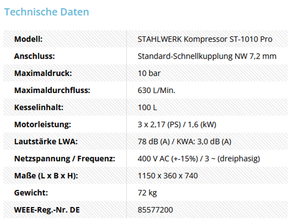 - Der Silent-Kompressor überzeugt durch eine hohe Laufruhe und ermöglicht geringe Geräuschemissionen von nur 78 dB, selbst beim Abrufen der Maximalleistung.